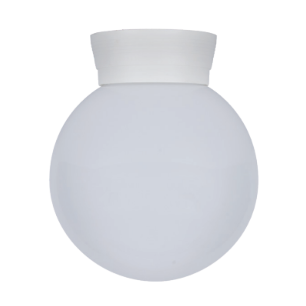 200mm diameter acrylic opal sphere complete with White Polycarbonate ceiling or wall mount base. Polycarbonate 200mm wall or ceiling mounted sphere light. Ideal for coastal areas.