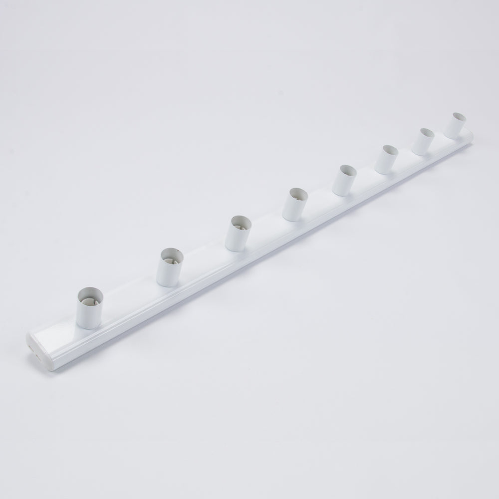 8 lamp Vanity light available in Black, Chrome, Satin Chrome and White. It requires 8xB15 lamps (not included), Domus recommends the Fancy Round frosted or clear in warm white or white.